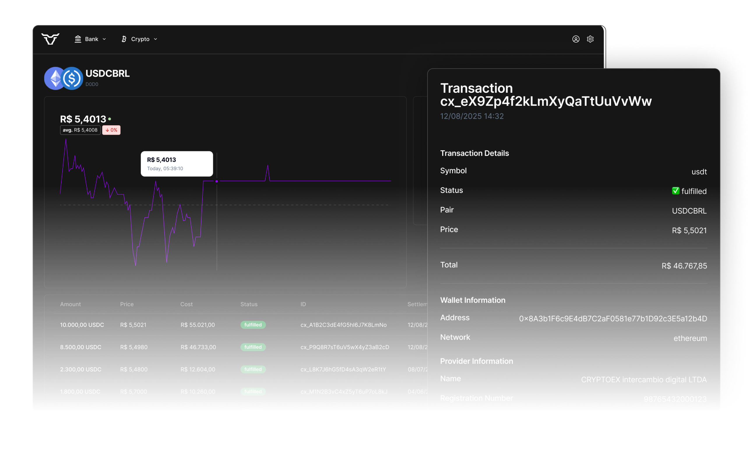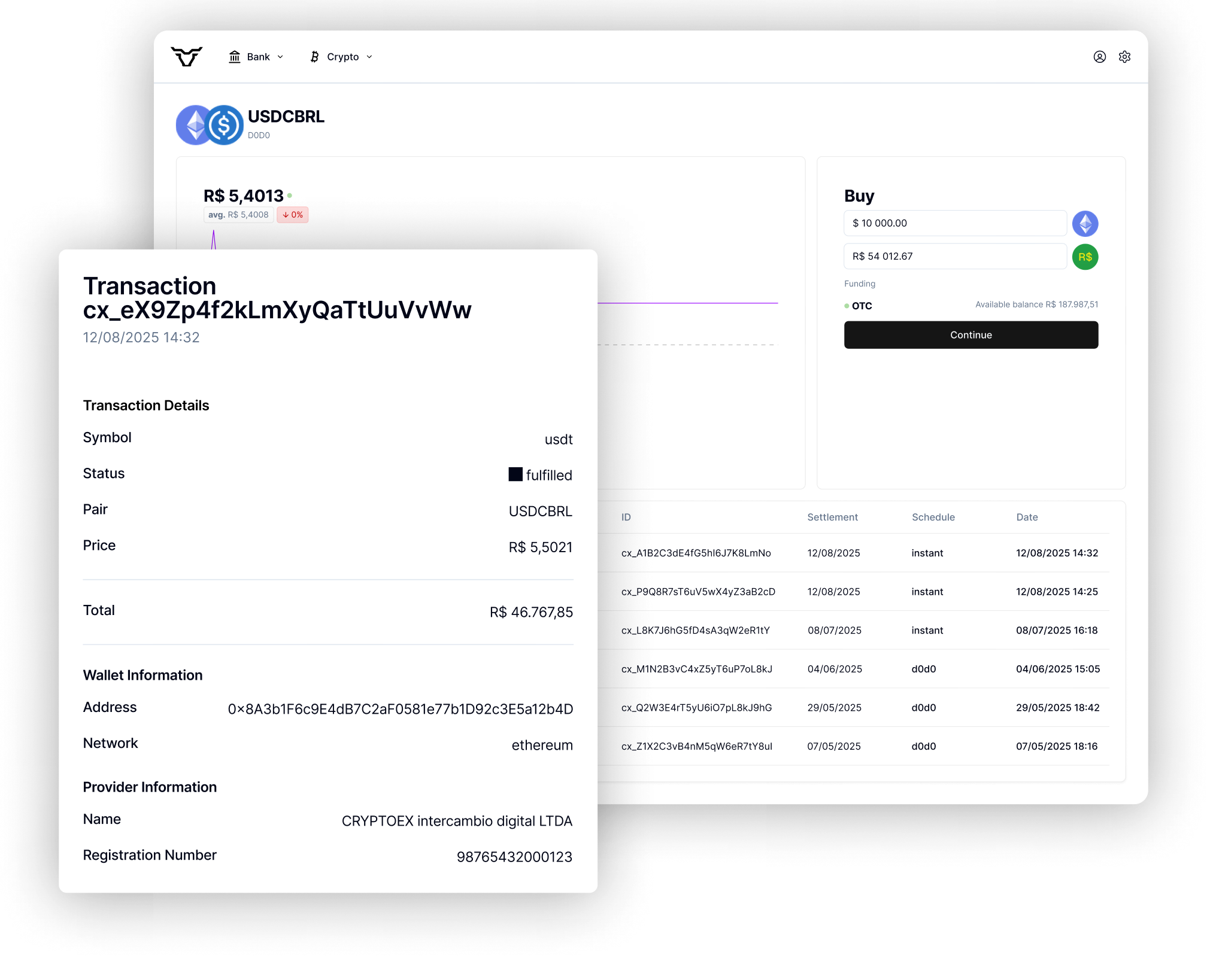 Accept PIX, boleto, TED, and more with one integration — optimized for local behavior. Instantly convert BRL to stablecoins (USDT/USDC), directly from your in-app banking account. Ideal for treasury, trading, or onboarding users.